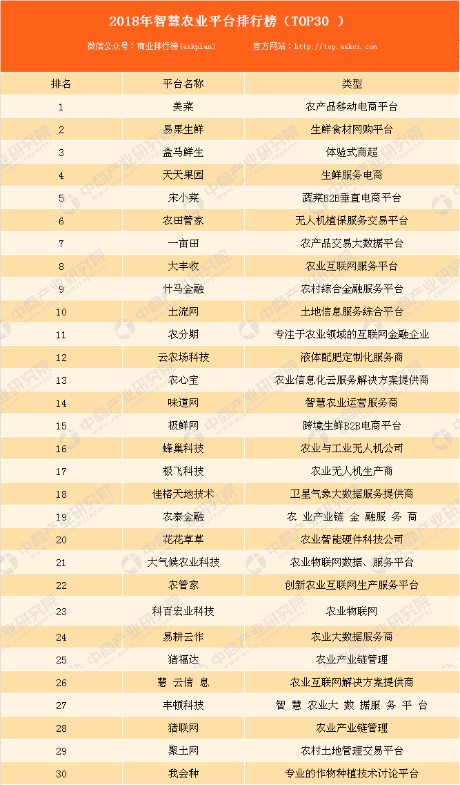 近日,2018年智慧農(nóng)業(yè)平臺(tái)排行榜top30排行榜出爐,據(jù)榜單顯示:進(jìn)入2018年智慧農(nóng)業(yè)平臺(tái)排行榜top30的前十平臺(tái)分別是:美菜、易果生鮮、盒馬鮮生、天天果園、宋小菜、農(nóng)田管家、一畝田、大豐收、什馬金融和土流網(wǎng)。2018年智慧農(nóng)業(yè)平臺(tái)排行榜top30具體排名情況如下: